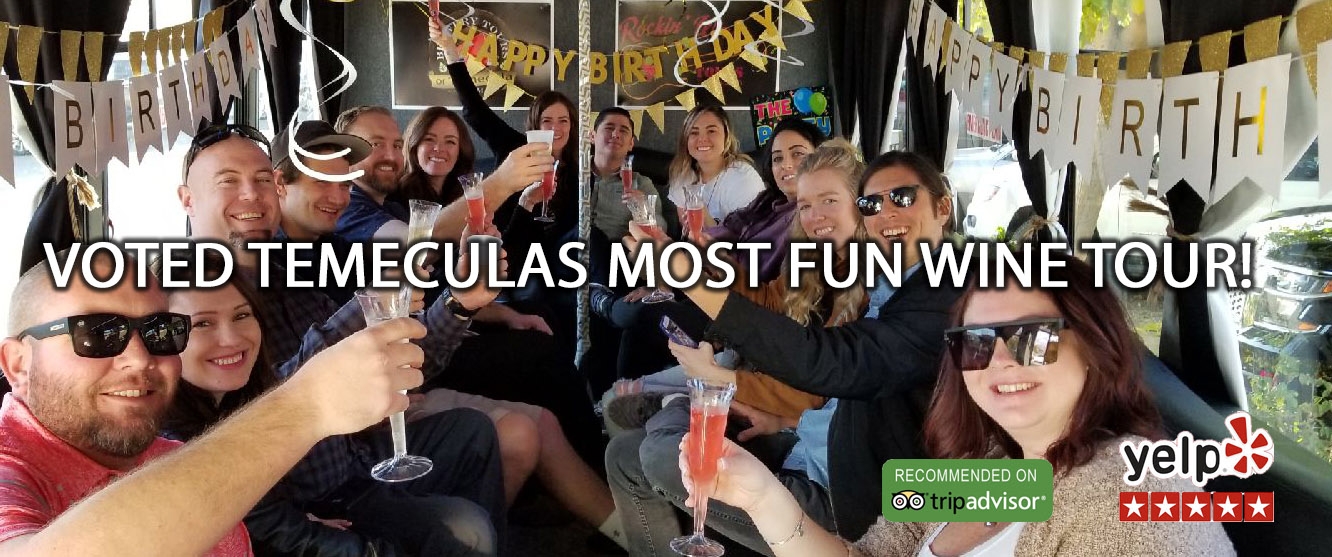 Rockin' Wine Tours is Temecula Valley's most fun private wine tasting tour provider. Located just minutes from San Diego, Orange, and Los Angeles Counties, we provide a one of a kind, fun, exclusive, and interactive Temecula wine tour experience for private groups of 10 or more. Our interactive tour guides are here to show your group a great time in our air conditioned decorated private party buses while sipping on the best wines in the Temecula Valley! Grab your crew and experience Temecula wine tasting at its finest!